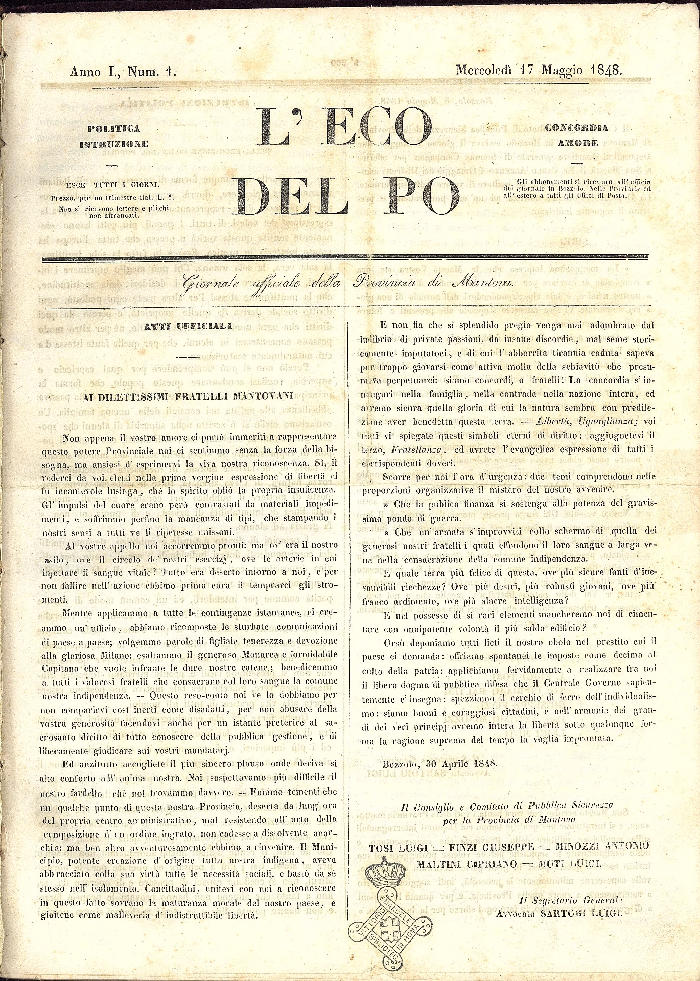 Tra la primavera e l’estate 1848, le campagne mantovane conoscono forme di comunicazione e partecipazione politica più libere rispetto alla città. La presenza dell’esercito sabaudo e dei volontari sostiene l’autorità del Governo provvisorio della Lombardia e favorisce la diffusione di sentimenti filoitaliani. Anche «L’Eco del Po», testata ufficiale della Provincia di Mantova uscita tra maggio e luglio 1848, circola più facilmente fuori che dentro la città.