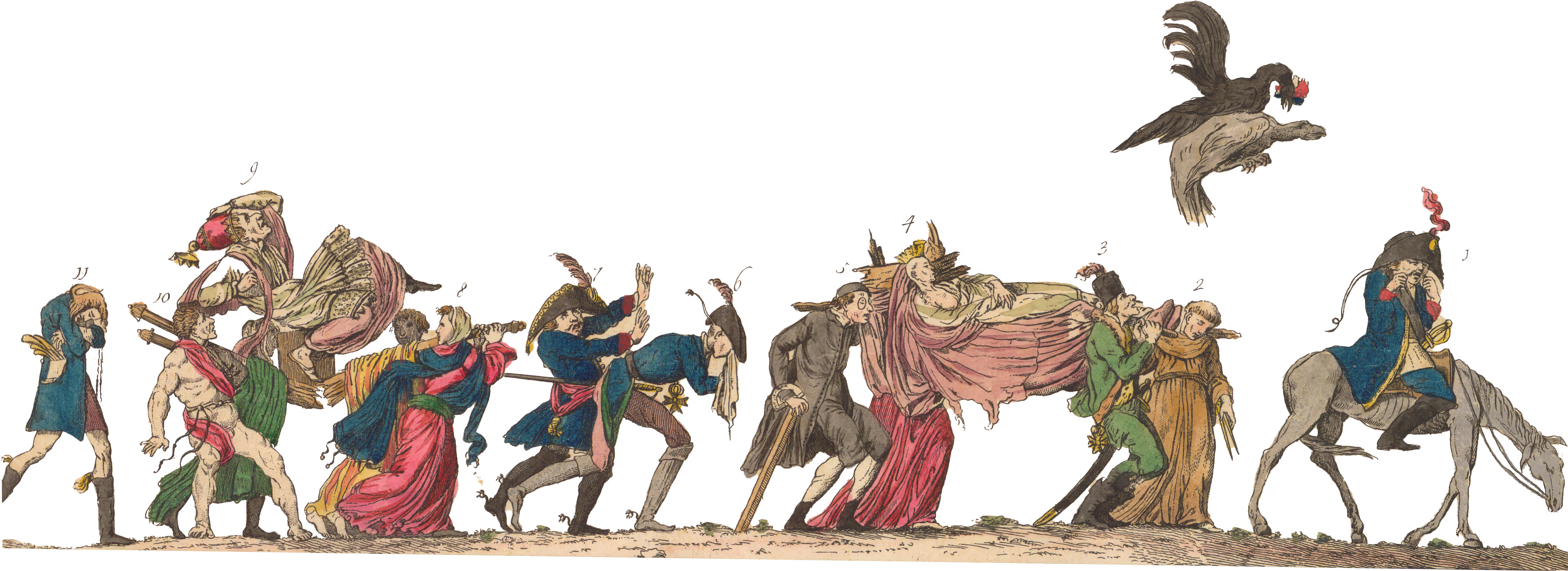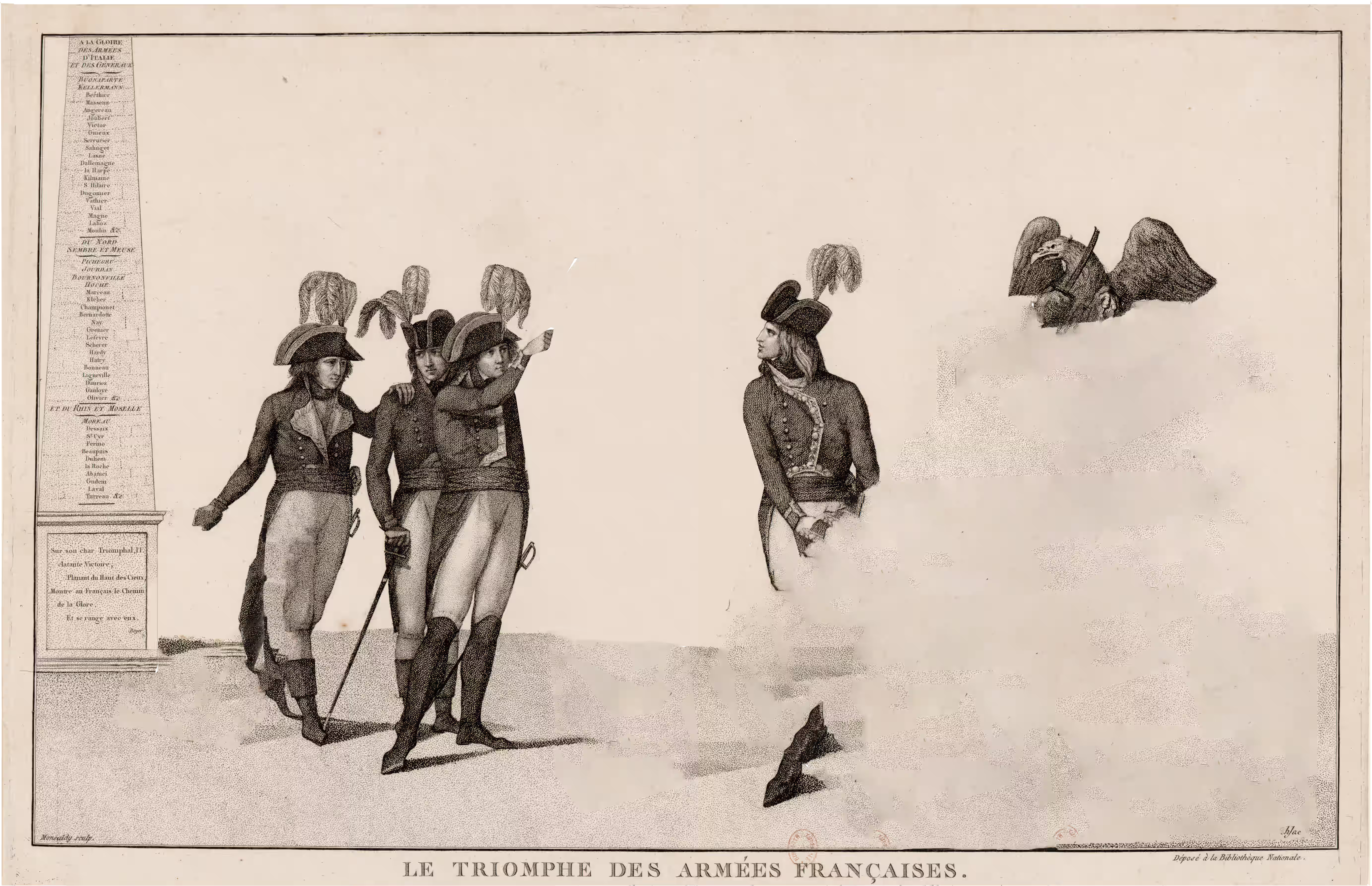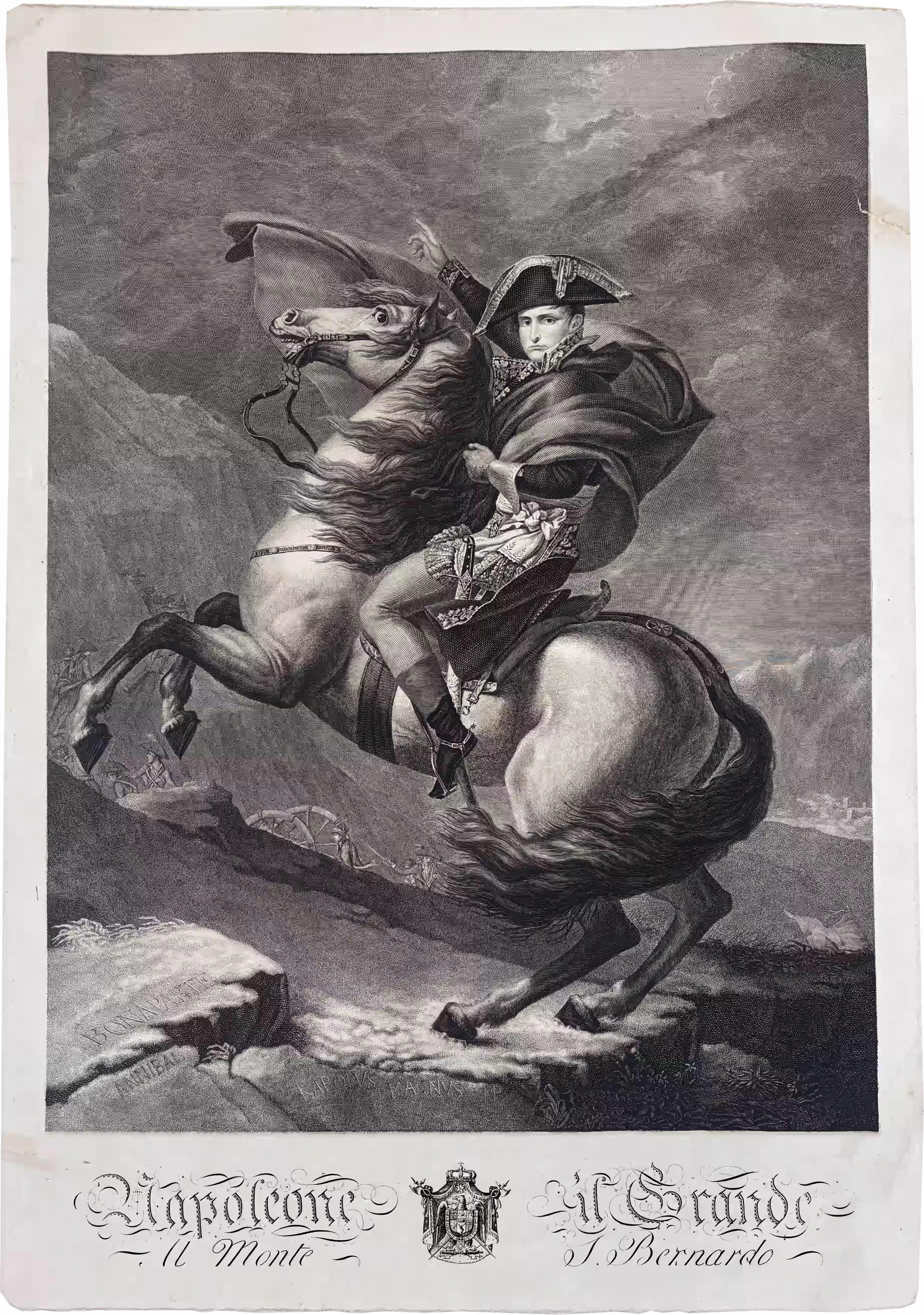 Quando i funzionari asburgici perlustrarono Palazzo Ducale alla ricerca di reperti napoleonici da eliminare si imbatterono in una stampa raffigurante una delle copie del celebre quadro di Jacques-Louis David dedicato all’attraversamento delle Alpi di Bonaparte. L’incisione era opera dell’incisore Giuseppe Longhi che dal 1796 aveva tradotto grandi quadri celebrativi in formati accessibili al grande pubblico.