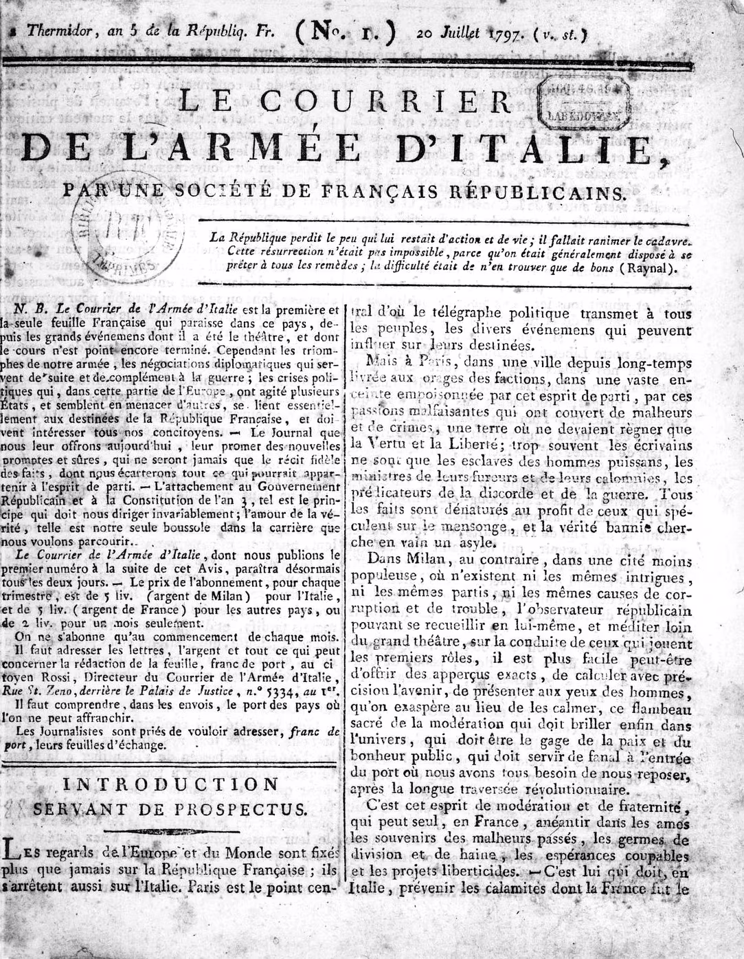 Per Bonaparte la campagna d'Italia fu una straordinaria occasione per presentarsi all’opinione pubblica non solo come generale, ma anche come leader politico. A questo scopo si impegnò nella creazione di giornali che dessero spazio alla narrazione delle sue imprese e che presentassero il suo punto di vista. Il più importante fu il «Courrier de l'armée d’Italie»: distribuito gratis ai soldati e venduto a Milano e Parigi, presentava una grafica accattivante e uno stile giornalistico moderno.