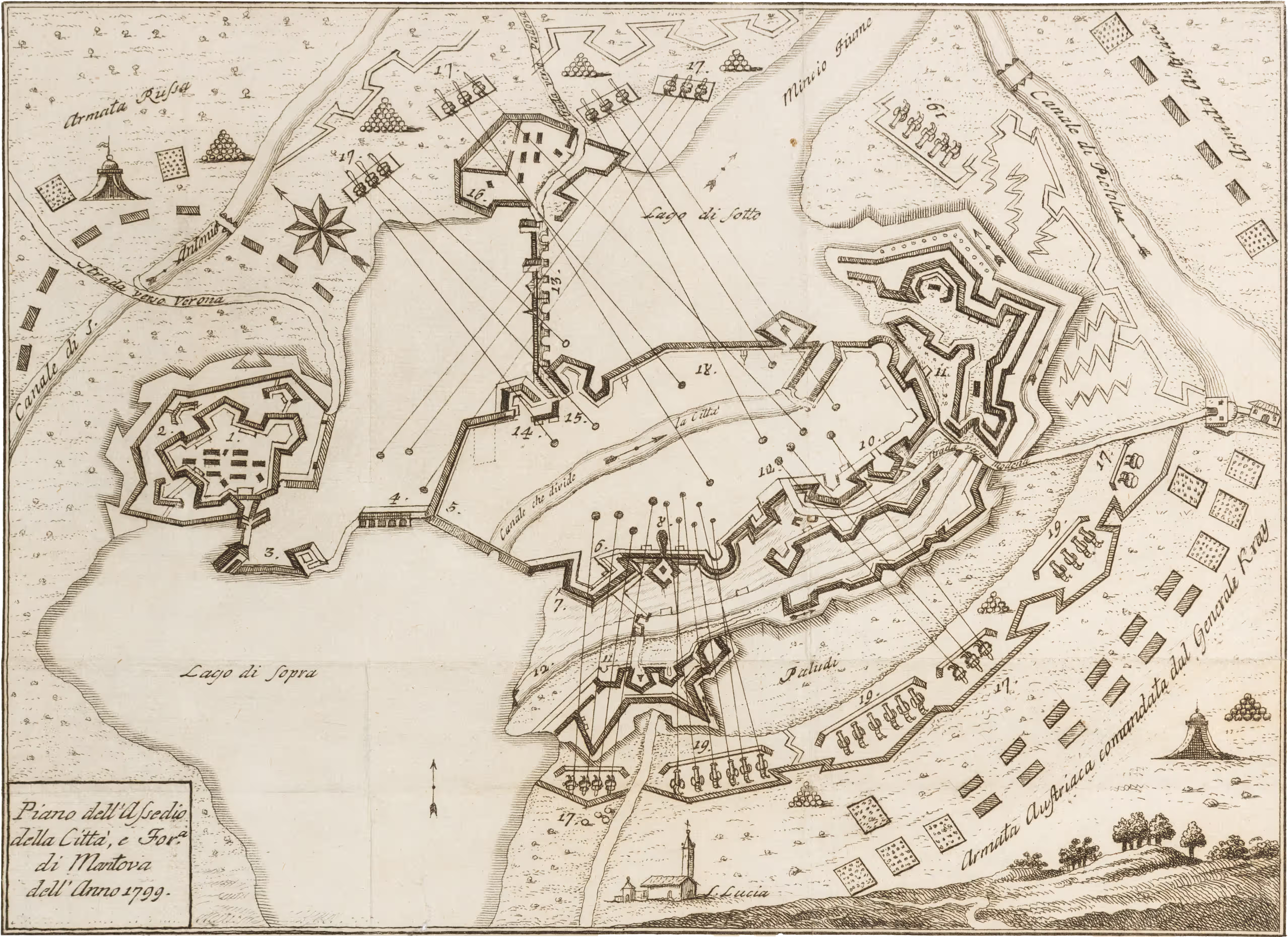 Nel 1799 una nuova coalizione delle potenze europee alla quale aderì anche la Russia avviò un’estesa controffensiva che aveva come teatro principale proprio la penisola italiana. Mentre Bonaparte era impegnato in Egitto, le truppe austro-russe riconquistarono rapidamente Lombardia e Piemonte. Resisteva Mantova che divenne ancora una volta teatro di un assedio, anche se a parti invertite.