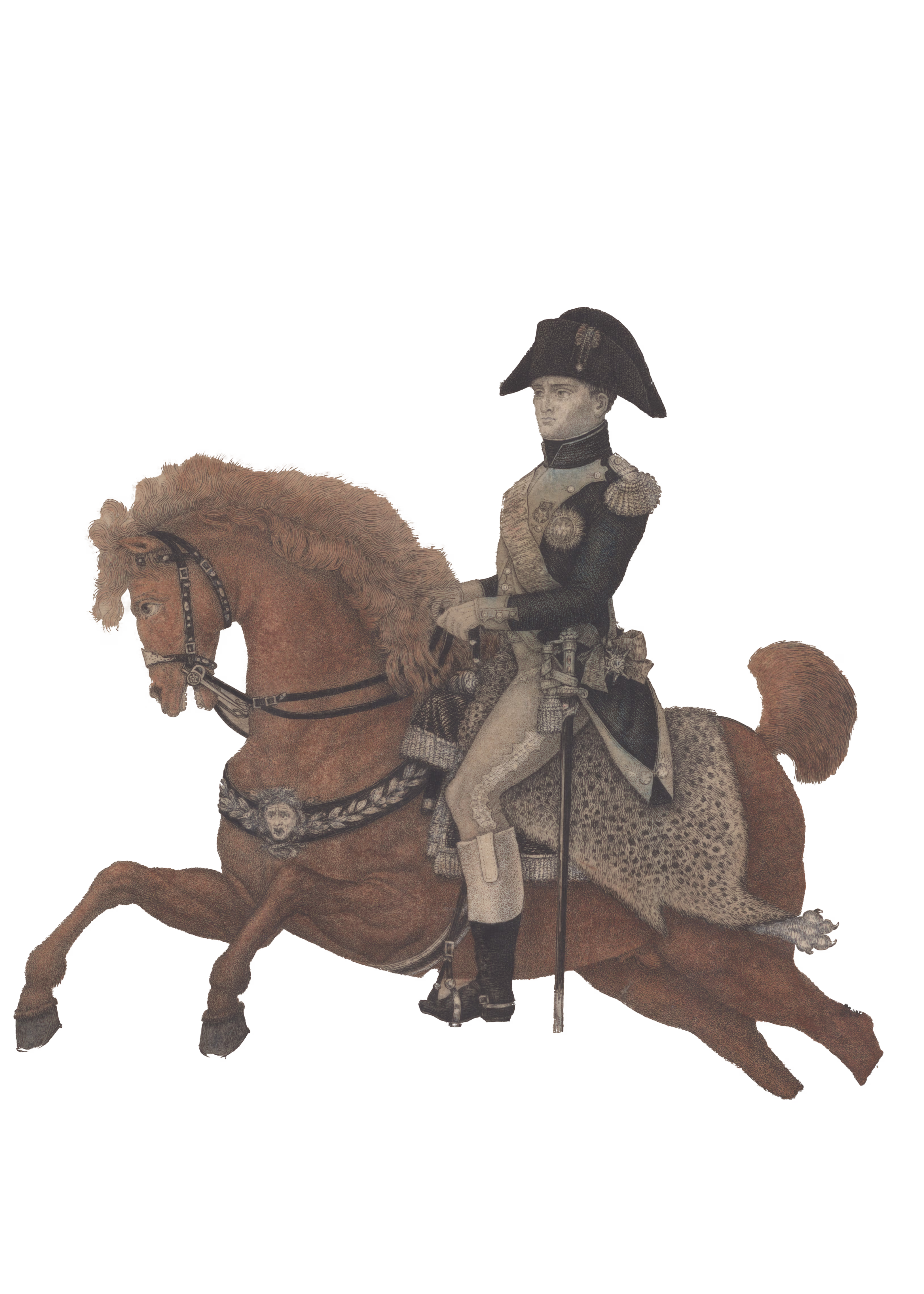 Basilio Lasinio coniugò costantemente il suo impegno nei corpi topografici delle armate cisalpine e poi italiche con la sperimentazione innovativa e apprezzata dell’incisione calcografica a colori. Ne è una declinazione efficace la ritrattistica immaginifica dell’imperatore volante a cavallo all’apice del suo successo politico e militare in occasione della vittoria del 2 dicembre 1805 contro le forze austro-russe in Moravia che consolidò il dominio francese sull’Europa.